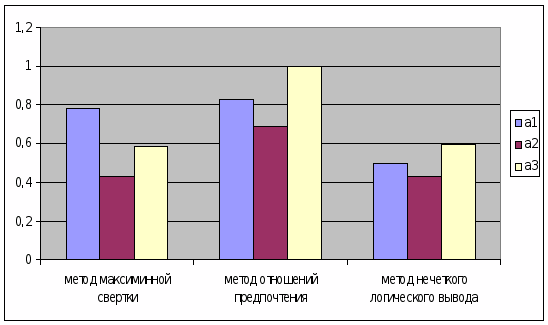 Несмотря на то, что исходная информация во всех рассмотренных примерах является последовательной и непротиворечивой, полученные результаты заметно отличаются. Кроме описанных выше нечетких методов принятия решений, для сравнения использовался метод анализа иерархий, который обычно дает результаты, хорошо согласующиеся с интуитивными представлениями экспертов при рациональном подходе к принятию решений.