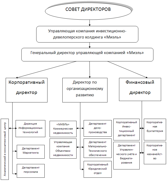 Компания «МИЭЛЬ» располагает довольно большим штатом сотрудников. Существуют 3 основных отдела, это «Корпоративный отдел», «Отдел по организационному развитию» и «Финансовый отдел». Над этими отделами стоит генеральный директор.