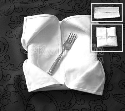 Оправив руками скатерть от сгиба к концам, складывает ее сначала вдвое, снова оправляет руками, складывает ее правой рукой еще раз вдвое и снова оправляет ее. Скатерть, сложенную в длину, официант кладет в передний левый угол стола свободными концами, вверх. Левой рукой он разворачивает ее сначала налево, а правой рукой два раза вправо.