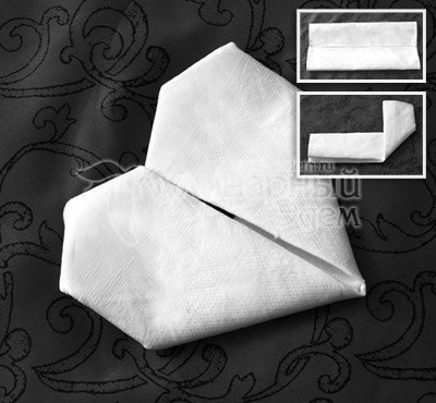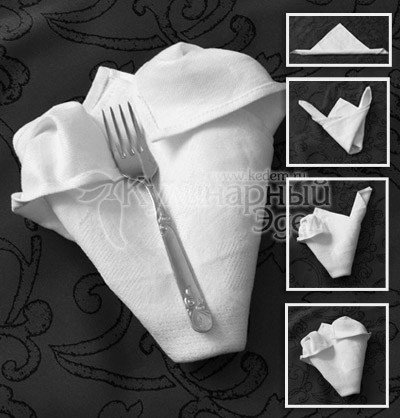 Конечно, салфетки можно свернуть вчетверо и разложить у каждого прибора, но несколько простых манипуляций с ними добавят вашему столу стиля и индивидуальности, создадут нужное вам настроение еще до того, как гости сядут за стол. Согласитесь, салфетка, вложенная в кольцо, свёрнутая в виде конверта для столовых приборов, в виде высокой свечи или лилии создают разное впечатление. Вот несколько простых способов складывания салфеток: