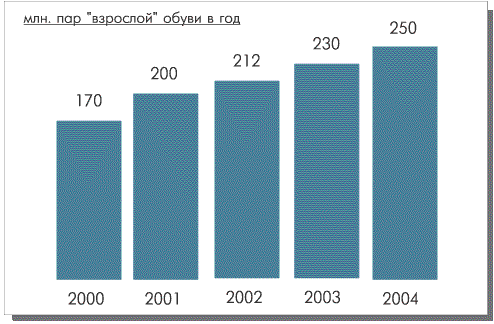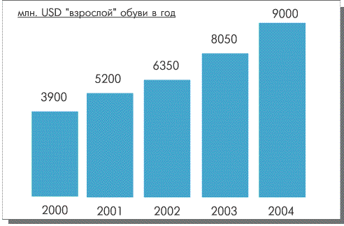 С 2005 по 2009 гг. объем продаж обуви в России вырос на 51,5% до 335 млн пар. Импорт обуви в Россию за этот же период увеличился на 40,4%: с 189 до 265 млн пар.