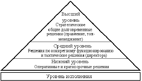 Иерархия управления - инструмент для реализации целей фирмы и гарантия сохранения системы. Чем выше иерархический уровень, тем больше объем и комплексность выполняемых функций, ответственность, доля стратегических решений и доступ к информации. Одновременно растут и требования к квалификации и личная свобода в управлении. Чем ниже уровень, тем больше простота решений, доля оперативных видов деятельности.[9]