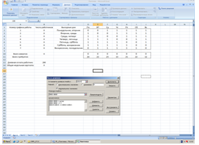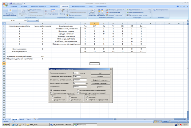 Работники риэлтерской компании должны работать пять дней подряд и иметь два выходных дня. Дневная оплата работника составляет 200 рублей. Исходя из особенностей работы, составлена таблица 1 требуемого числа работников по дням недели. Необходимо составить график занятости, обеспечивающий требуемый уровень обслуживания и удовлетворяющий потребность в персонале при минимальных затратах на оплату труда.