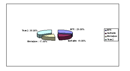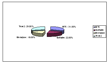 Совершенная конкуренция предполагает, что на рынке имеется множество независимых фирм, самостоятельно решающих, что продавать и в каких количествах. Данная организация ведет ценовую конкуренцию, проводя её посредством искусственного сбивания цен на продукцию. Чтобы проверить, выдерживает ли ЗАО «Ростовская Сотовая Связь» конкуренцию, исследуем количество подключений к сети сотового оператора, которого оно представляет по сравнению с другими операторами. Определим охват рынка на рисунке по примерным данным статистического управления по УР.