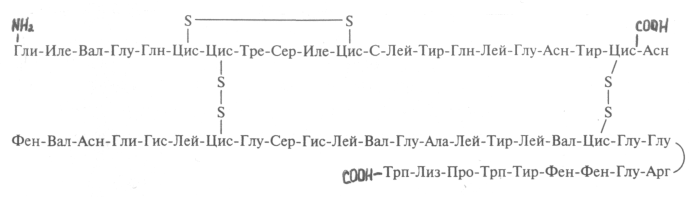Молекула інсуліну утворена двома поліпептіднимі ланцюжками, що містять 51 амінокислотний залишок: ланцюг з N-кінцевим гліцином називається A-ланцюжок, складається з 21 амінокислотного залишку, B-ланцюжок утворений 30 амінокислотними залишками. Поліпептідні ланцюжки з'єднуються двома дисульфідними містками через залишки цистєїну, третій дисульфідний зв'язок розташований в A-ланцюжку.