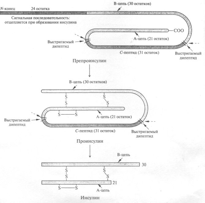 Синтез інсуліну відбувається в β-клітках і починається з утворення на рибосомах одноланцюжкового пептиду, що складається з 104—110 амінокислотних залишків, — препроінсуліну. Ця молекула включає А-ланцюг, В-ланцюг і розташований між ними вставний С-пептид. Препроінсулін потрапляє в шорсткий ендоплазматичний ретікулум, по якому пересувається до секреторних гранул. У цистернах шорсткого ендоплазматичного ретікулума відбувається відщеплювання частини молекули і залишається преінсулін, що складається з 81—86 амінокислотних залишків. У комплексі Гольджі відбувається упаковка гормону в секреторні гранули, в яких проінсулін піддається подальшому протеолітичному розщепленню. В результаті відщеплюються С-псптид і два діпептида, сполучаючі С-пептид з фрагментами А і В, а ланцюги А і В з'єднуються дисульфідними містками, утворюючи молекулу двохланцюгового інсуліну. У секреторних гранулах виявляються проінсулін, частково розщеплений проінсулін, інсулін і С-пептид. Всі вони виводяться з β-клітин в кров.