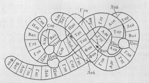Поліпептидна основа молекули інсуліну (первинна структура) згорнута спіралеобразно (вторинна структура), а спіралі, у свою чергу, згущуються в складні утворення, що визначають просторову конфігурацію молекули інсуліну або її третинну структуру.