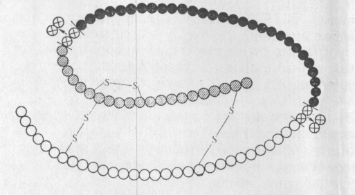 Чорні кружки – С-ланцюг, сірі – А-ланцюг, білі – В-ланцюг, перехрещені – дипептиди, вищепленні в процесі утворення активного гормона.