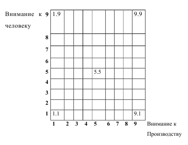 В западном бизнесе популярна теория "управленческой решетки", разработанная Р.Блейком и Дж.Мутоном21. Они указывали, что трудовая деятельность разворачивается в силовом поле между производством и человеком. Первая силовая линия определяет отношение руководителя к производству. Вторая линия (вертикальная) определяет отношение руководителя к человеку (улучшение условий труда, учет желаний, потребностей и т.д.).