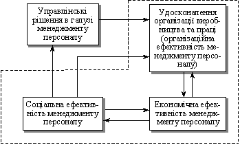 Усі три складники ефективності менеджменту персоналу (економічний, організаційний і соціальний) тісно пов’язані та взаємодіють, хоча деяка перевага належить організаційній ефективності. Це пояснюється тим, що управлінські рішення насамперед трансформуються в конкретні організаційні заходи. Завдяки чіткій організації виробництва та праці, а отже, кращому використанню всіх виробничих ресурсів, поліпшуються економічні показники діяльності підприємства. Цим створюються кращі фінансові можливості для підвищення якості трудового життя персоналу (зростання трудових доходів, поліпшення умов праці тощо), що є проявом соціальної ефективності менеджменту персоналу. А якщо матеріальні, організаційні, соціально-психологічні, морально-етичні та інші умови роботи персоналу поліпшуються, то це обов’язково віддзеркалюється на подальшому зростанні і організаційної, і економічної ефективності менеджменту персоналу. Цей взаємозв’язок складників ефективності менеджменту персоналу показано на рис 1.1