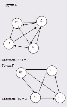Самая наибольшая связность наблюдается в группах А и Г. Это говорит о том, что каждый участник группы общается со всеми сотрудниками, находящимися в его неформальной группе.