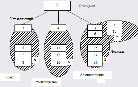 Структура коммуникационных сетей в компании "Галакта" не достаточно развита. В компании вместо 3-х формальных групп образовано 4 неформальных. Группы А, Б и Г общаются между собой, а группа В общается с другими группами только лишь посредством руководителя компании. Таким образом, будет целесообразно провести в компании реструктуризацию. Выделить в компании 4 отдела. 1-ый отдел – сбыта (2, 5, 8, 7). Руководителем отдела назначить сотрудника № 5, так как он является лидером мнения в этой группе. Второй отдел – производства. Руководителем этого отдела будет сотрудник № 4 (он и является формальным руководителем). Третий отдел – административный. Руководителем этого отдела будет сотрудник № 3 (он и является формальным руководителем). Сотрудники № 3, 14, 13, 12, 6. Четвертый отдел – логистики. Руководителем этого отдела будет сотрудник № 10, так как он регулирует всю информацию, поступающую в группу. Организационная структура компании будет иерархический и будет выглядеть следующим образом.
