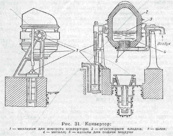Приведен общий, вид обычного конвертора грушевидной формы, сваренного из толстой листовой стали и футерованного внутри огнеупорными материалами. Снаружи в средней части конверторов имеются два цилиндрических выступа, называемых цапфами” которые служат для опоры и поворота конвертора. Одна из цапф делается полой и соединяется с воздуховодом; от цапфы к днищу через трубу и воздушную коробку подводится воздух. В днище конвертора имеются отверстия — фурмы, через которые под давлением 2,0— 0,5 am