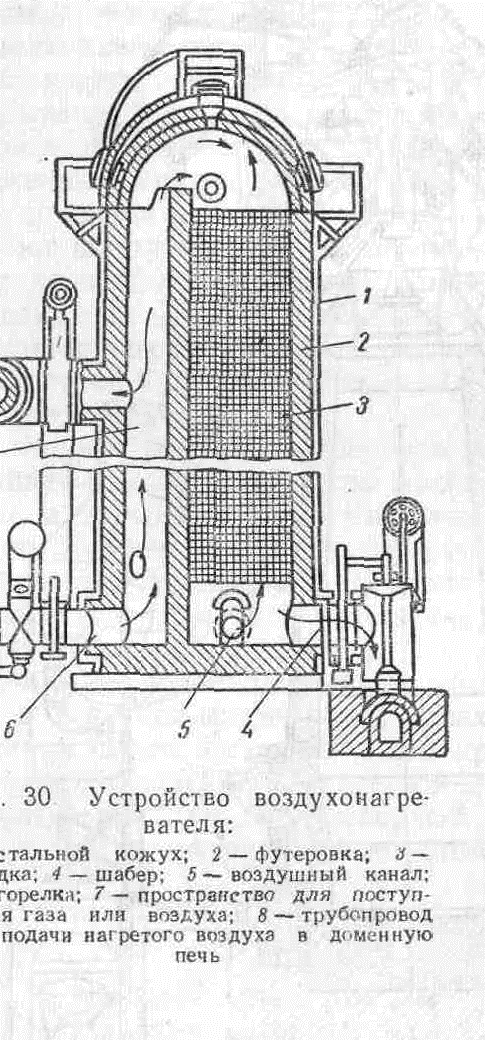 Современные воздухонагреватели (рис 1) способны нагревать воздух в количестве 2000—2500 м3/мин до температуры 900 — 1100° С. Увеличение количества воздуха и повышение его температуры достигаются за счет увеличения поверхности нагрева насадок до 16000— 18000 m2 и сжигания газов до 3600 ма/час и более. Высота воздухонагревателя составляет 46 м при