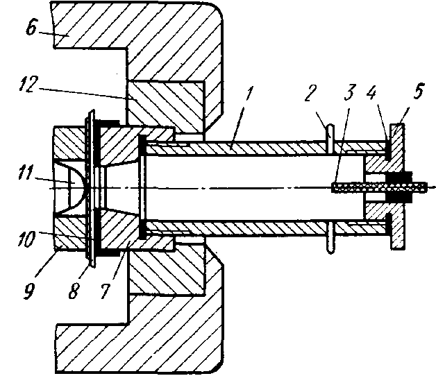 В качестве одного из таких методов можно предложить метод определения прочности сцепления эмалевого покрытия с металлом, описанный в работе [7]. Измерения могут быть осуществлены при помощи простой приставки к прибору типа ПТЛ (рис.13) для испытания листового металла выдавливанием.