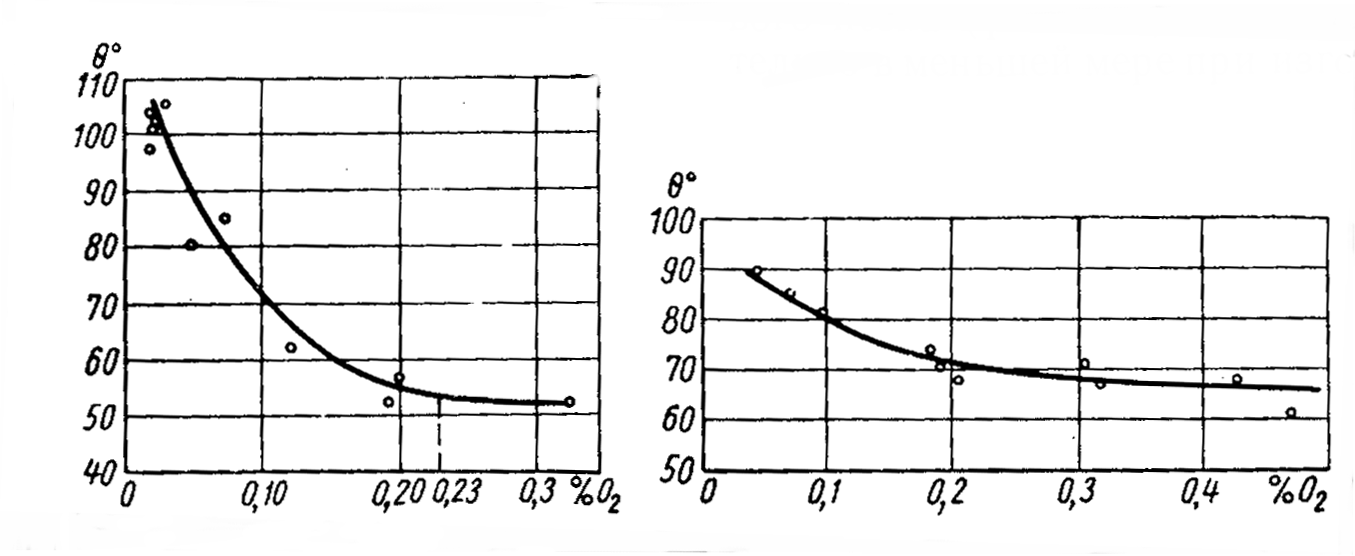 Из результатов экспериментальных исследований, проведенных И. В. Валисовским в ЦНИИТмаше отметим установленную зависимость степени смачивания от химического состава поверхностных слоев жидкого металла и формы. Чем больше химический потенциал реакций, протекающих на поверхности раздела металл—форма, тем меньше краевой угол смачивания. Поэтому увеличение степени окисленности стали резко уменьшает краевой угол смачивания при изготовлении форм из кварцевого песка (рис. 1) и значительно в меньшей мере при изготовлении форм из хромомагнезита или хромистого железняка (рис. 1, б) [6].