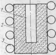 оверхность образца, покрытая пригаром, должна в раствор поваренной соли. К угольному электроду 3 и к зачищенному уголку быть сторону цилиндра /. Внутрь цилиндра через трубку 2 наливают 10%-ный раствор поваренной соли. К угольному электроду 3 и к зачищенному уголку образца присоединяют концы электрической цепи, питаемой через трансформатор переменным током напряжением 2,5 в (можно применять и более высокое вторичное напряжение, но не выше 12в). В цепь, включают миллиамперметр. При испытании в образец вдавливают пуансон и измеряют силу тока, проходящего через образец. Критерием прочности сцепления пригара с металлом может служить величина деформации, при которой сила тока, проходящего через образец, составляет минимальную величину.Зная толщину слоя пригара и сопротивление внешней цепи, проводников, можно установить суммарную величину площади, которая вследствие определенной деформации оказалась свободной от пригара (площадь отскоков).