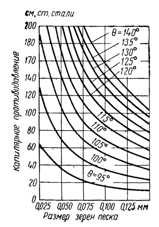 В этих условиях, как известно, возникает капиллярное противодавление pk, противодействующее внедрению жидкости в капилляры. Кроме того, проникновению металла будет препятствовать сравнительно низкая температура формы. По мере прогревания стенок формы из формовочной смеси выделяются водяные пары и газы, создающие в порах газовое противодавление рr, которое также препятствует проникновению металла.
