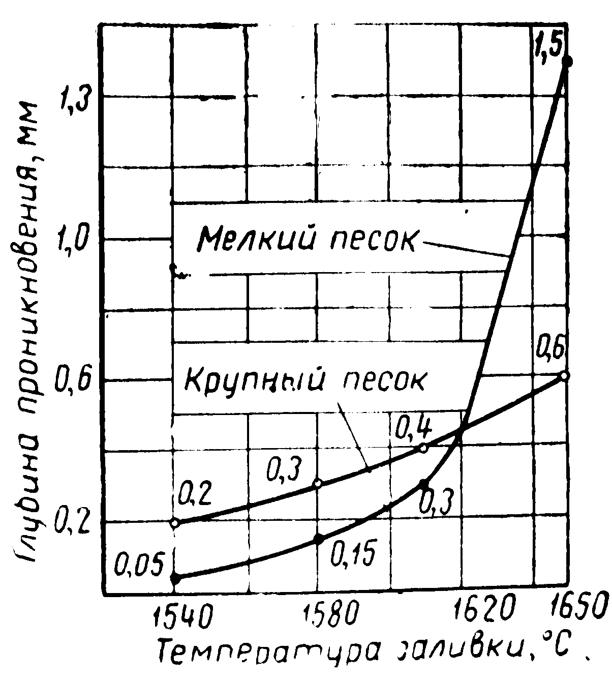 В холодной форме, если давление металла на стенку формы равно критическому, металл проникнет в поры формы на глубину не более половины диаметра зерна, т. е. на доли миллиметра. При прогревании поверхности формы металл, находясь под критическим давлением, будет проникать в глубь формы по мере распространения изотермы, соответствующей температуре плавления металла.
