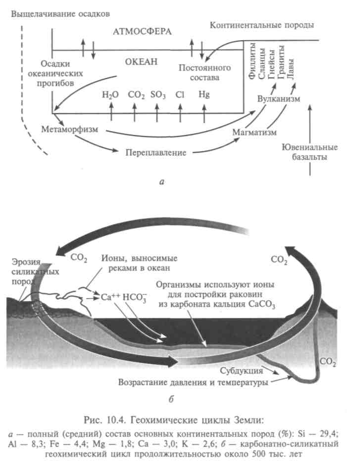 начался мощный круговорот веществ, включающий переработку первичной коры под действием солнечной энергии, гравитации и всей биосферы (рис. 10.4, а).