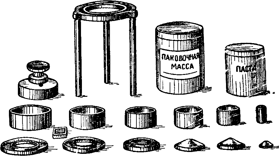 Для изготовления тиглей из огнеупорной массы имеется специальный разборный металлический штамп, состоящий из двух половинок, стягиваемых на обоих концах гайками с накаткой. В огнеупорную массу для изготовления тиглей входит: 30% корунда № 325, 30% электрокорунда № 100, 40% шамотной глины. Указанный материал замешивают на жидкости, состоящей из 90% воды и 10% отработанного машинного масла. Полученную смесь закладывают в штамп и прессуют. Затем тигель осторожно извлекают из пресс-формы и ставят в муфельную печь для просушки на l,5-2 часа при температуре 300-400°.