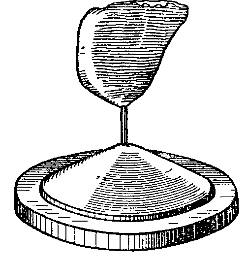 Такая технология еще сохранилась во многих местах до настоящего времени. Остановимся на отдельных операциях технологии несколько подробнее. Необходимый протез изготавливают первоначально из воска, при этом весьма тщательно обрабатывают его вручную, применяя очень тонкий инструмент (шпатели и др.). Если восковая модель оказывается во всех отношениях безукоризненной, ее закрепляют на штифте на подставке (рис. 1).
