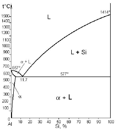 На рисунке 12 представлена кривая изменения горячеломкости сплавов системы Al – Si в зависимости от содержания второго компонента. Видно, что максимум горячеломкости соответствует сплаву, содержащему 0.25% Si. При дальнейшем увеличении концентрации кремния горячеломкость снижается и при содержании более 2% становится равной нулю. Снижение горячеломкости происходит благодаря уменьшению линейной усадки в интервале кристаллизации (вследствие увеличения количества жидкой фазы, кристаллизующейся при постоянной температуре). Увеличение количества эвтектики в сплаве создаёт также благоприятные условия для интердендритного питания и, следовательно, для залечивания возникающих трещин жидкостью эвтектического состава.
