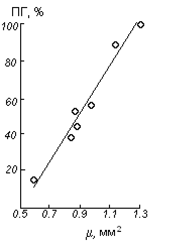 Рис.2 Зависимость показателя горячеломкости (ПГ) сплава меди с 3% Sn и 0.5% Fe от размера зерна ( ), полученного в разных плавках.