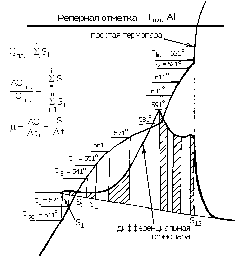 получены при ДТА (рис.17). Под относительной теплотой понимается процентное отношение теплоты, поглощённой к моменту достижения в образце температуры t>i>(Q>i>), к общему количеству теплоты, поглощённому при расплавлении образца (Q>пл.>). Относительная теплота Q/ Q>пл.> определялась из отношения площади, описанной дифференциальной кривой к моменту достижения температуры t>i>(n>i>>=1 >S>i>) и площади, описанной дифференциальной кривой при полном расплавлении образца (достижение температуры t>liq>) (n>i>>=1 >S>i>). Под темпом плавления понималось отношение изменения теплоты (Q>i>), поглощённой в интервале температур, к величине этого интервала. Для упрощения расчётов величина t>i> выбиралась постоянной и составляла 10 C. По полученным результатам были построены температурные зависимости изменения относительной теплоты и темпа плавления, которые можно интерпретировать как кинетику образования жидкой фазы в кокильном образце при его расплавлении или как кинетику выделения твёрдой фазы при затвердевании сплава в условиях литья в кокиль. Именно этими данными и следует руководствоваться в процессе проверки результатов исследования вышеуказанных сплавов методом кольцевой пробы.
