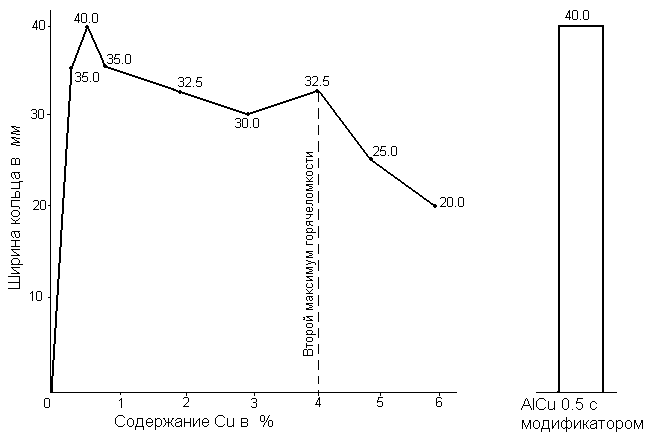 Al – Si 0.25, Al – Cu 0.5, Al – Si 0.25 – Cu 0.25. Величина горячеломкости этих сплавов различается незначительно и находится в пределах 37.5 – 42.5 мм по показаниям используемой кольцевой технологической пробы.