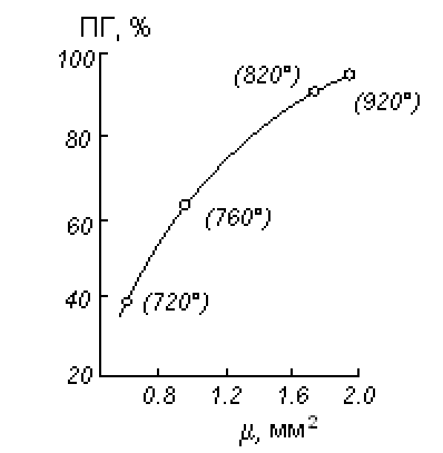 Рис.1 Зависимость показателя горячеломкости (ПГ) сплава алюминия с 4% Cu от размера зерна ) при разном перегреве расплава.