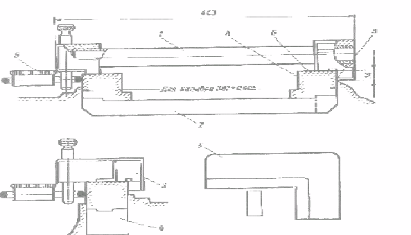 Предварительно отвернув гайки, снимают крышку упорного подшипника вместе с вкладышем. Выпрессовку вкладыша из постели блока производят с помощью специального приспособления (рис. 3), изготовленного из бронзы и устанавливаемого в сверление коленчатого вала так, чтобы головка приспособления не касалась поверхности постели вкладыша в блоке цилиндров. Поворачивая коленчатый вал при помощи валоповоротного механизма, выводят вкладыш из постели.