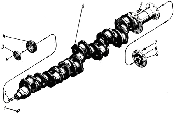 Коренные шейки сплошные. Для подвода масла от коренных шеек к шатунным выполнены наклонные каналы 9 с вставленными в них трубками. На заднем конце вала имеется фланец для присоединения к якорю генератора. Два отверстия во фланце с резьбой служат для рассоединения коленчатого вала и якоря генератора отжимными болтами. Между фланцем отбора мощности и седьмой коренной шейкой установлена разъемная шестерня 8 со спиральными зубьями, передающее вращение распределительному валу, валам топливного и водяного насосов.