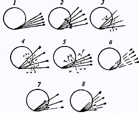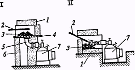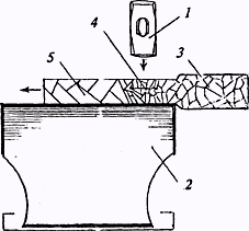 Рис. 29. Рекристаллизация стали: 1 - молот; 2 - наковальня; 3 - состояние кристаллов до ковки: 4 - кристаллы, подвергающиеся ковке; 5 - кристаллы после ковки