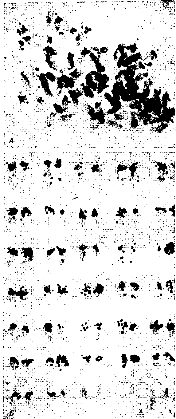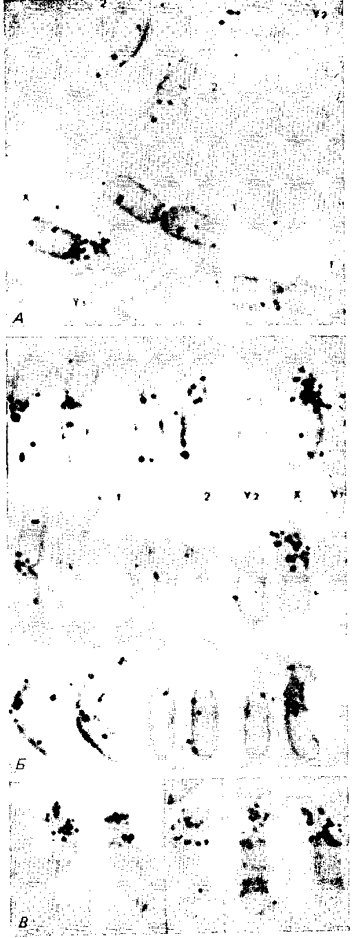 Использована та же проба ДНК, меченная тритием, что и в предыдущем эксперименте– В 64 аутосомах и в хромосомах X и Y центромеры терминальные; только в двух крупных аутосомах они медиальные. А. Клетка, в которой у большинства хромосом метка накопилась вблизи центромеры. Б. Кариотип из другой клетки: 64 телоцентрические хромосомы расположены в зависимости от их длины и у всех у них метка сконцентрирована вблизи центромеры единственного плеча. В двух крупных метацентрических хромосомах в конце нижнего ряда метка отсутствует; в Х-хромосоме – самой крупной в наборе – метка также отсутствует, а в Y-хромосоме ее можно видеть вблизи центромеры.