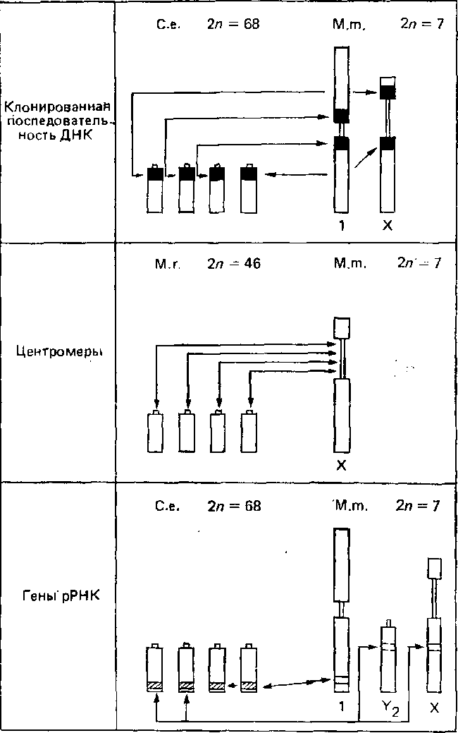 Последовательности ДНК, центромеры и гены, кодирующие рРНК, при клонировании, несмотря на коренные хромосомные перестройки, сохраняют свое местоположение в хромосоме, что соответствует предсказаниям теории хромосомного поля. Для простоты на схеме представлены только по четыре из 68 хромосом Cervus elaphus и 46 хромосом Muntiacus reevesl. По этой же причине изображены лишь некоторые из хромосом М. muntjak. Объяснения см. табл. 2. Стрелки показывают, что перестройки могут происходить в обоих направлениях, т.е. как от высокого числа хромосом к низкому, так и в обратную сторону.