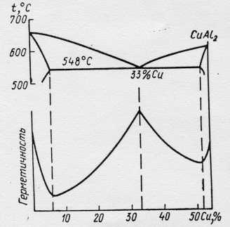 Герметичность сплавов изучали следующим образом.: Из отдельных сплавов; относящихся к бинарной системе Аl – Сu, отливали плоские пластины толщиной 30 мм. Во всех случаях перед заливкой сплав перегревали на одинаковое число градусов над температурой ликвидуса. Все отливки охлаждали в идентичных условиях. После охлаждения к одной из сторон пластины подводили керосин под давлением 50 ат. Визуальным наблюдением за противоположной стороной пластины устанавливали, протекает или не протекает керосин сквозь отливку. Если керосин не протекал, на токарном станке с обеих сторон пластины снимали слой толщиной 1 мм и опыт с керосином повторяли. Снятие слоев с обеих сторон пластины и пробу на герметичность повторяли до тех пор, пока на открытой стороне отливки не появлялись мелкие капли керосина (отпотевание). Опыты, в которых обнаруживали течь керосина в виде струи, отбрасывались, так как это указывало на наличие трещин в сплаве. Полученные при экспериментах результаты иллюстрирует рис. 7.