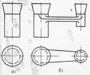 Естественно, что отливка с усадочной раковиной в сечении в большинстве случаев непригодна к употреблению, так как её прочность и некоторые другие служебные качества (например, герметичность) резко снижаются. Поэтому при изготовлении отливок стремятся вывести усадочную раковину в специальный дополнительный объем,. который добавляют к рабочему телу отливки, изменяя таким образом ее конфигурацию. Этот объем, называемый прибылью, затем отрезают. На рис.5,а дана простейшая цилиндрическая отливка (слиток) с прибылью, на рис. 5,б – фасонная отливка с двумя прибылями