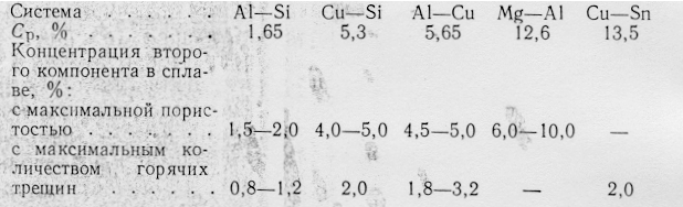 пористости – большей частью в интервале при затрудненности питания междуосных пространств дендритов .Таким образом, развитие усадочных дефектов того или иного типа оказывается непосредственно связанным с положением фигуративной точки сплава на диаграмме состояния относительно точек Ср, С’р и Сэ а также Сск.