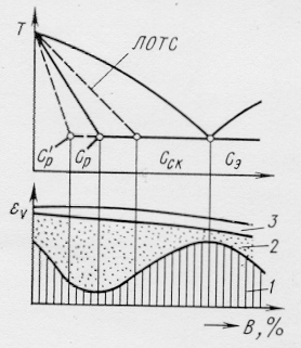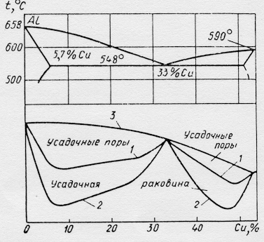 Впервые общая схема распределения усадочных пустот между раковиной и порами, в зависимости от Ткр была приведена в работах А.А. Бочвара. Последующие исследования уточнили зависимость с учетом положения ЛОТС (или точки Сск.) и неравновесного солидуса. Максимум развития пористости фиксируется при концентрациях вблизи точек Ср или С’р (см. рис. 1).