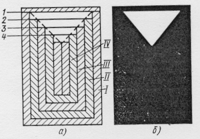 В начале затвердевания образуется контурная корка 1 (рис. 3, а). В связи с тем, что объем возникшей твердой фазы меньше объема жидкости, затраченной на образование корки, уровень жидкости внутри слитка понижается до горизонтали 1. В следующий период времени затвердевает слой II, причем усадка, происходящая при кристаллизации, компенсируется понижением зеркала жидкости до уровня 2. В дальнейшем при затвердевании слоев 111 и Ю уровень жидкости понижается соответственно до горизонталей 3 и 4.