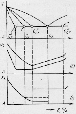 1. В сплавах с существенной растворимостью в твердом состоянии (Ср >1 – 5 %) на участке до точки СА ск.Еl изменяется по некоторой ниспадающей кривой, а на участке между точками СА ск. и СВ ск. наблюдается закон аддитивности – прямолинейная зависимость (сплавы А1 – Мg и др.). Иногда излом кривой происходит в точках Ср или С'р, а на участке Ср – СА ск. , отмечается площадка (сплавы А1 – Si).