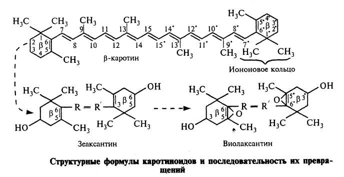 Имеются доказательства, что каротиноиды выполняют защитную функцию, предохраняя хлорофилл от фотоокисления. Еще в 1913 г. Д. И. Ивановский установил, что в пробирках, выставленных на прямой солнечный свет, степень разрушения хлорофилла зависела от концентрации каротиноидов в растворе.