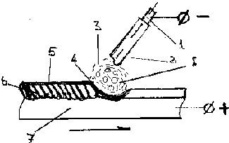 а рисунки I дуга горит между стержнем электрода (1) и основным металлом (---). Под действием теплоты дуги электрод и основной метал плавится, образуя металлическую сварочную ванну (4). Капли жидкого металла (8) с расплавляемого электродного стержня переносятся в ванну через дуговой промежуток. Вместе со стержнем плавится покрытие электрода (2), образуя газовую защиту (3) вокруг дуги и жидкую шлаковою ванну на поверхности расплавленного метала. Металлические и шлаковые ванны вместе образуют сварочную ванну. По мере движения дуги металл сварочной ванны затвердевает и образуются сворной шов (6). Жидкий шлак по мере остывания образует на поверхности шва твёрдую шлаковою корку, которая удаляется после остывания шва.Для обеспечения заданного состава и свойства сварку выполняют электродами, к которым предъявляют специальные требования.