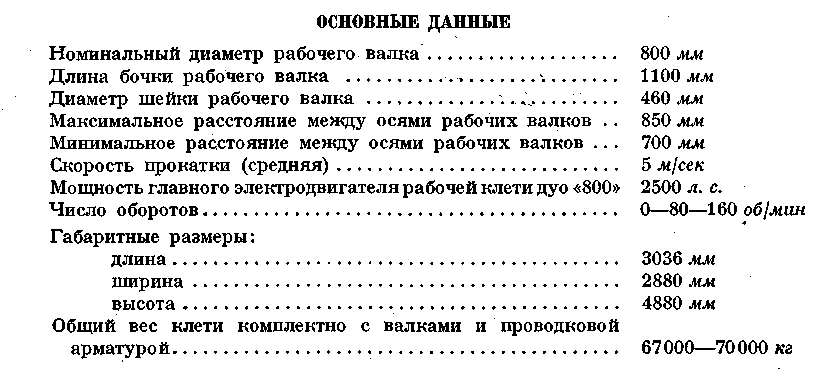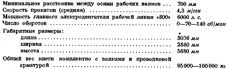 Привод клети осуществлен через шестеренную клеть дуо «800», промежуточные шпиндели и главную муфту от электродвигателя постоянного тока мощностью 2500 л. с. с регулируемым числом оборотов 0—80—160 об/мин.
