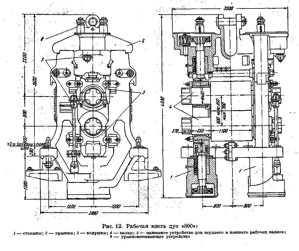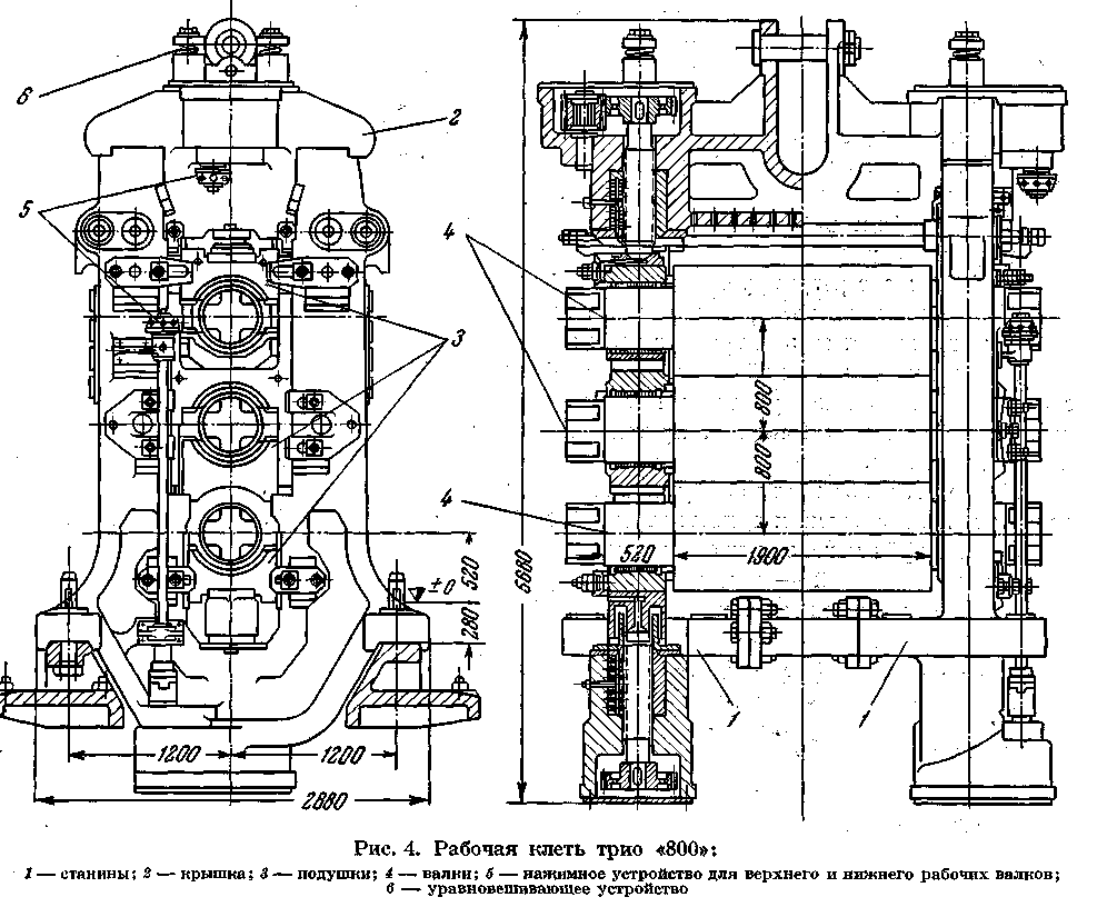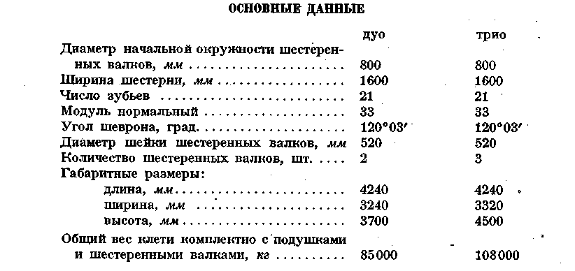 Подушки клети — из чугуна, а подшипники шестеренных валков имеют баббитовую заливку.