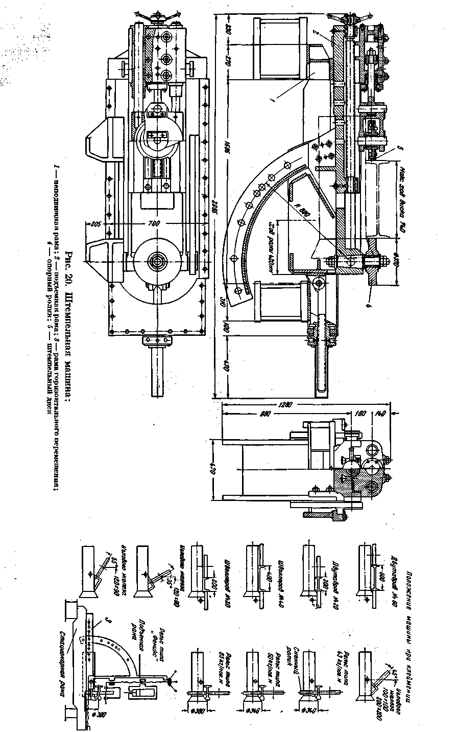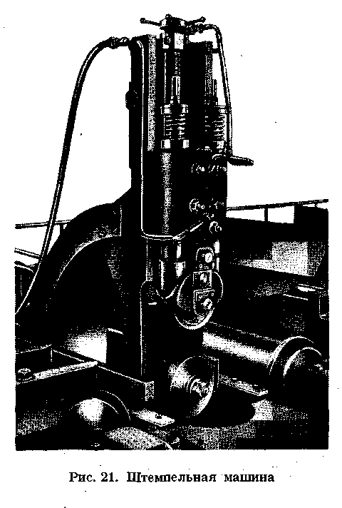 Штемпельная машина состоит из неподвижной, подъемной рамы и рамы горизонтального перемещения, опорного ролика и штемпельного диска.