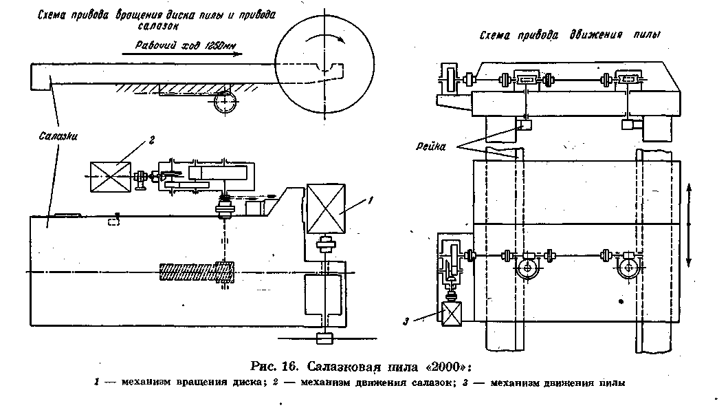 Механизм движения салазок состоит из салазок с приболченными к ним смежными бронзовыми планками и зубчатой рейки с косым зубом, обеспечивающими наиболее плавную подачу салазок пилы во время резки.