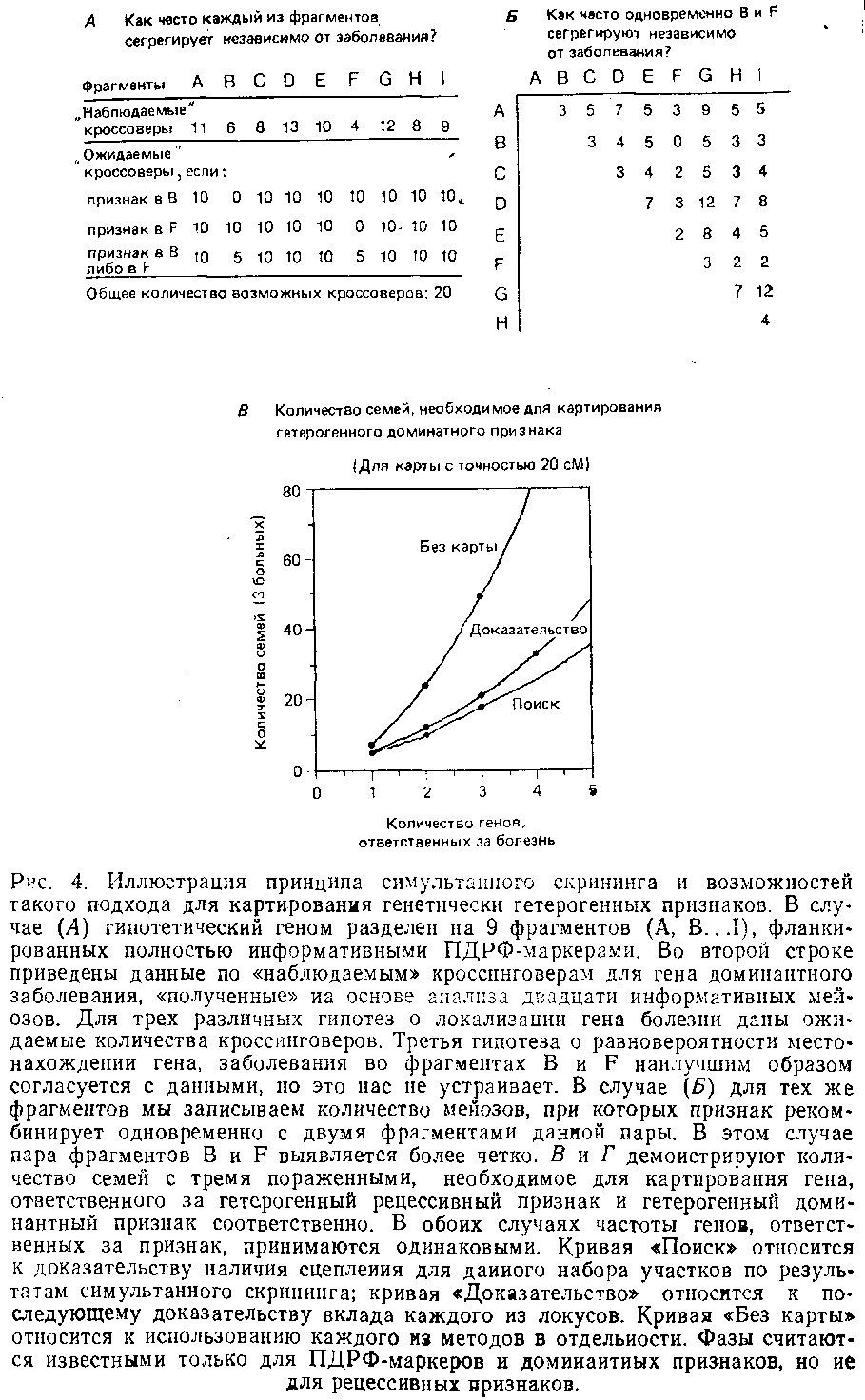 4. Симультанный скрининг генома с использованием малых семей. Доступность полной карты сцепления ПДРФ человеческого генома делает возможным выявить сцепление, даже если в изучаемой популяции сегрегирует более чем один локус. Этот недавно разработанный метод, известный как симультанный скрининг, подводит к естественному обобщению стандартного метода картирования сцепления.