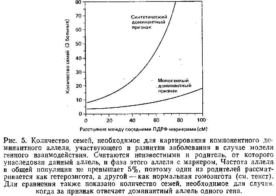 Для заболевания с простым типом наследования относительно легко построить карту сцепления. Рассчитав сумму ELOD-баллов, можно прямо оценить требуемую величину выборки. На рис. А, Б показано число ядерных семей с двумя или тремя пораженными, которое требуется, чтобы гарантировать 50%-ную вероятность успеха при картировании доминантного или рецессивного признака. Это число является функцией плотности расположения используемых ПДРФ-маркеров. Рисунок демонстрирует количество семей, необходимое 1) в случае, когда несколько маркеров рестрикционного полиморфизма используются по отдельности, и 2) если задействован весь потенциал карты ПДРФ, т.е. используются фланкирующие маркеры. Как следует из рис. 1, необходимое количество семей вполне эффективно при наличии геномной карты ПДРФ, отстоящих друг от друга на расстоянии 20–30 см.